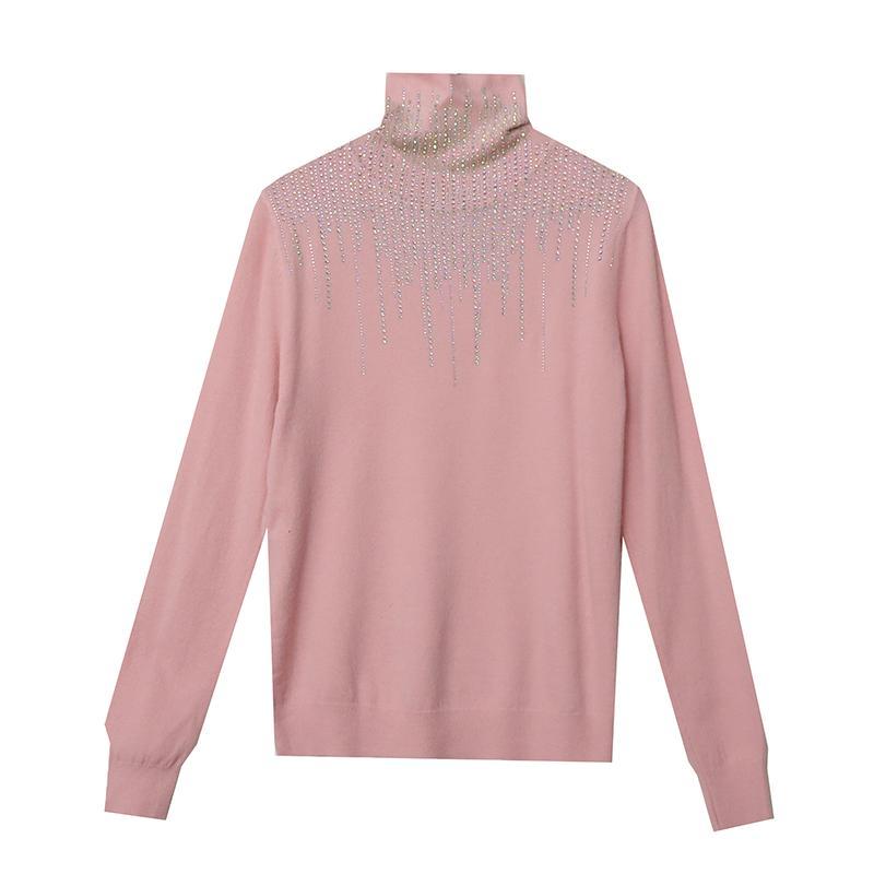 タートルネック レディース 秋冬 ヨーロピアン ニット 高弾性 トップス 長袖 キラキラ 装飾 ラインストーン ビーズ カジュアル ピンク 黒 オレンジ