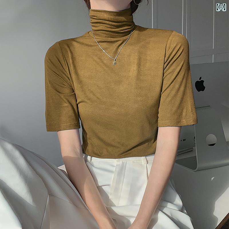 タートルネック 半袖 レディース 大人 夏 トップス 五分袖 快適 スリムフィット ヨーロピアン シンプル エレガント 無地 白 グレー 黒 日常 オフィス