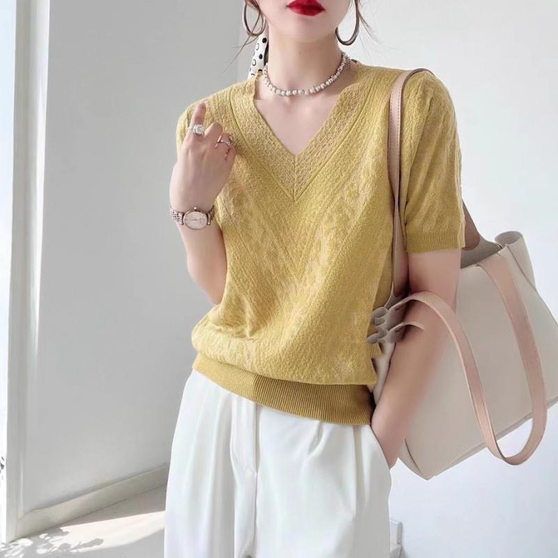 ・カテゴリ: セーター・スタイル: エレガント・主な素材: アクリル50~70%、綿30%以下・厚さ: 薄手・組み合わせ: 単品・フィット: ゆったり・袖タイプ: レギュラー・ネックライン: Vネック・袖丈: 3分袖・着用方法: プルオーバー・カラー展開: イエロー、ホワイト、グリーン、ブラック・サイズ展開: S、M、L、XL、XXL