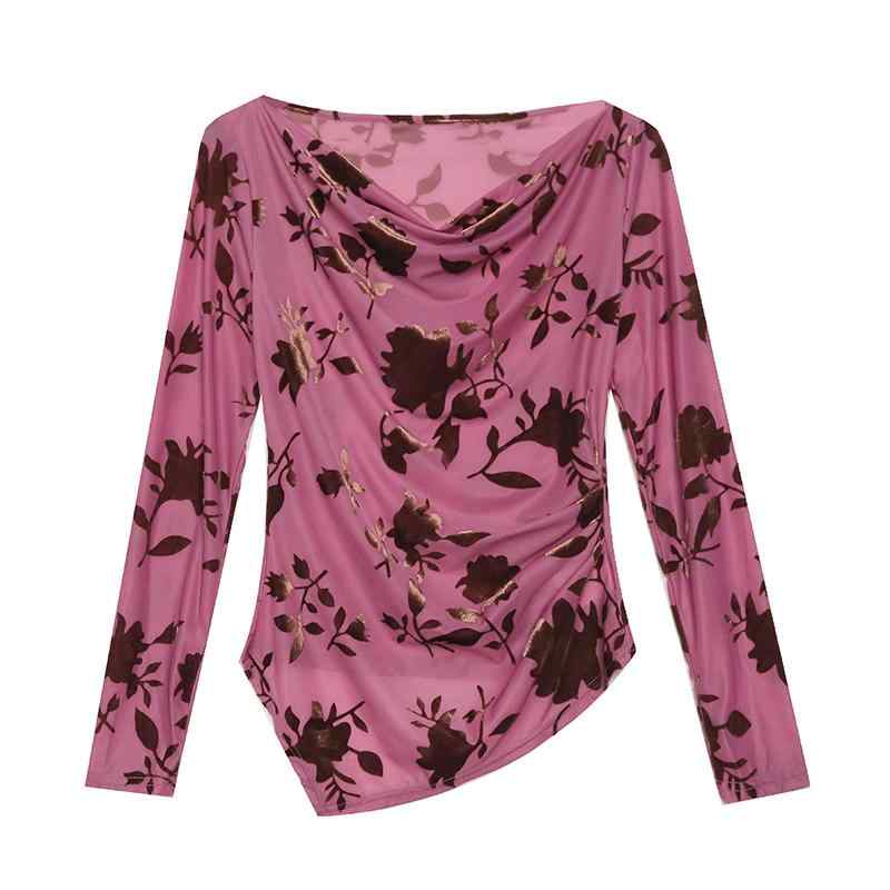 カットソー 長袖 レディース 秋 トップス ヨーロピアン ドレープ アシンメトリー 柔らかい インナー 大きいサイズ スリムフィット プリント セクシー スタイリッシュ 黒 ピンク 花柄