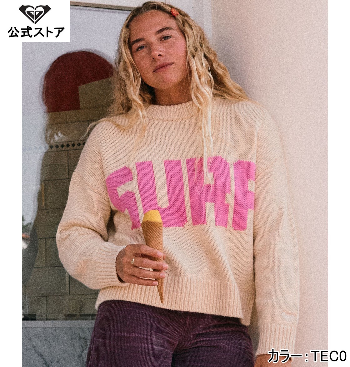 ミドルゲージのクルーネックセーター。ドロップショルダーで少しゆったりとしたシルエットです。襟、裾、袖口はリブの仕様。トレンドのピンクの糸で編み込んだ「SURF」「SNOW」のメッセージがROXYらしい一枚です。採寸サイズ 身丈 身幅 肩幅 袖丈XS535454.544S55565545M56585745 ※単位は(cm)。 素材:アクリル100%