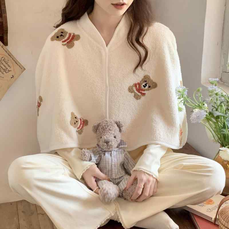 ・対象: レディース・素材: フリース・シーズン: 冬、春、秋・スタイル: カジュアル・丈: ミドル丈・カラー展開: ブルー、ピンク、ライトパープル・柄: 小熊、ドット、千鳥格子、麦穂柄・機能: 保温・加工: 刺繍・特徴: 厚手