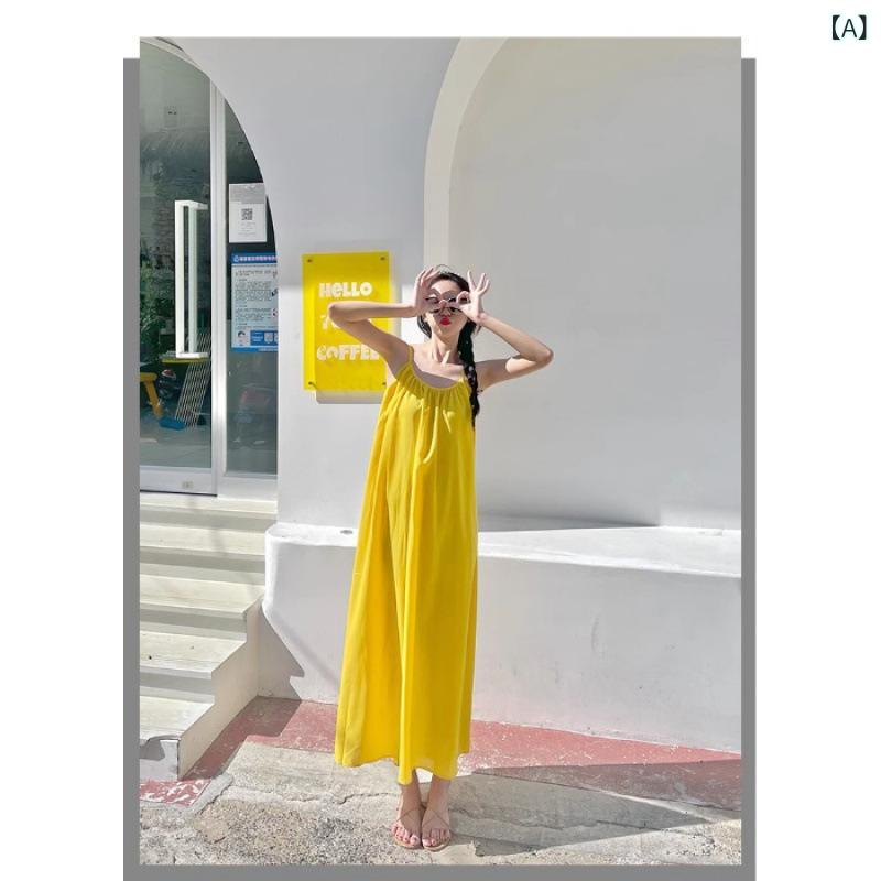 夏休み風ゆったりストラップワンピースロングスカート 海辺の 休暇 魅惑的 バックレス サスペンダー ドレス レディース 夏の aライン スカート 優しい 黄色の ロング スカート