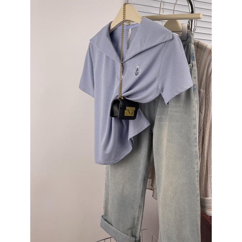 春 コーデ レディース ファッション オシャレ カワイイ シンプル きれいめ ナチュラル 上品カジュアル 婦人服 ブルー ネイビーカラー 半袖 Tシャツ 夏 フレンチ シンプル トップス