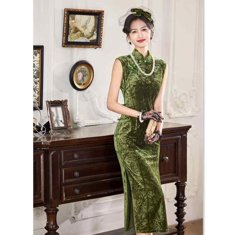チャイナドレス レディース ジルコニアベルベット ジャカード織り ロング丈 ノースリーブ スリット入り 春夏 新中式 レトロ 中国風 エレガント スリムフィット