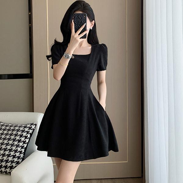 ワンピース 夏 黒 スクエアネック 小柄 Aライン おしゃれ 上品 高見え