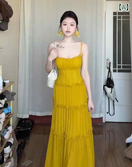スリムフィット サスペンダードレス 海辺の 休日 魅惑的 サスペンダー スカート フレンチ 美しい ユニークな 黄色の スリム ドレス 2025 春