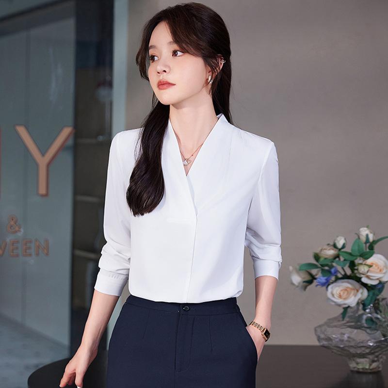 ブラウス レディース イージーケア Vネック 長袖 白シャツ CA風 客室乗務員 公務員 面接 正装 ビジネス オフィス 制服 仕事着 ユニフォーム フォーマル スリムフィット プルオーバー ストレッチ ポリエステル素材