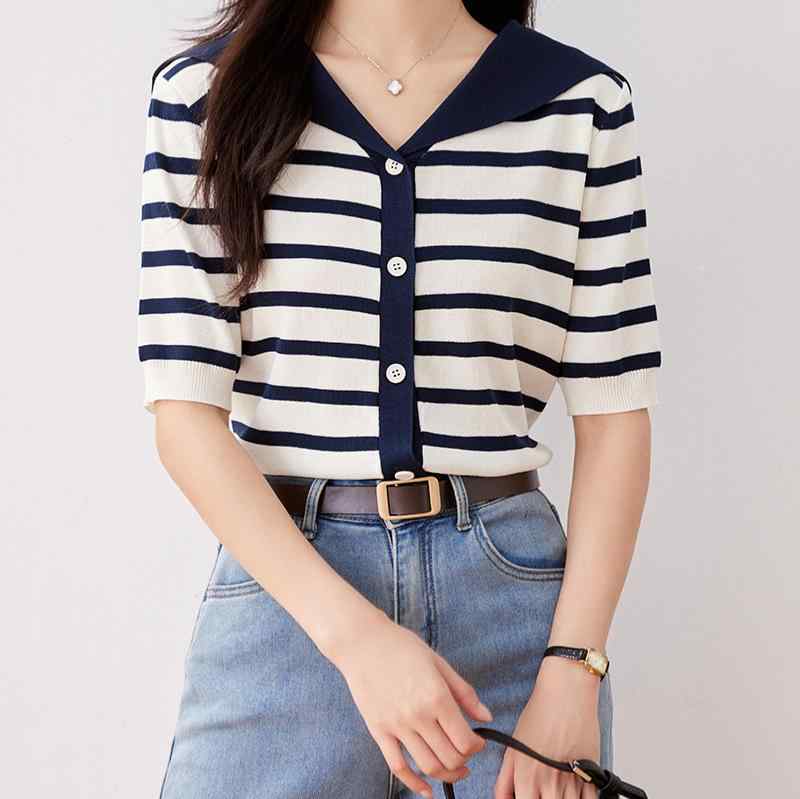 ・カテゴリ: ニット、セーター・素材: ポリエステル・柄: ストライプ・厚さ: 薄手・組み合わせ: 単品・シルエット: ゆったり・袖のタイプ: 通常袖・ネックライン: Vネック・袖丈: 五分袖・デザイン: パッチワーク・カラー: ストライプ・サイズ: S、M、L、XL・スタイル: 休暇スタイル、エレガント・素材混率: 95%以上・前立て: シングルブレスト