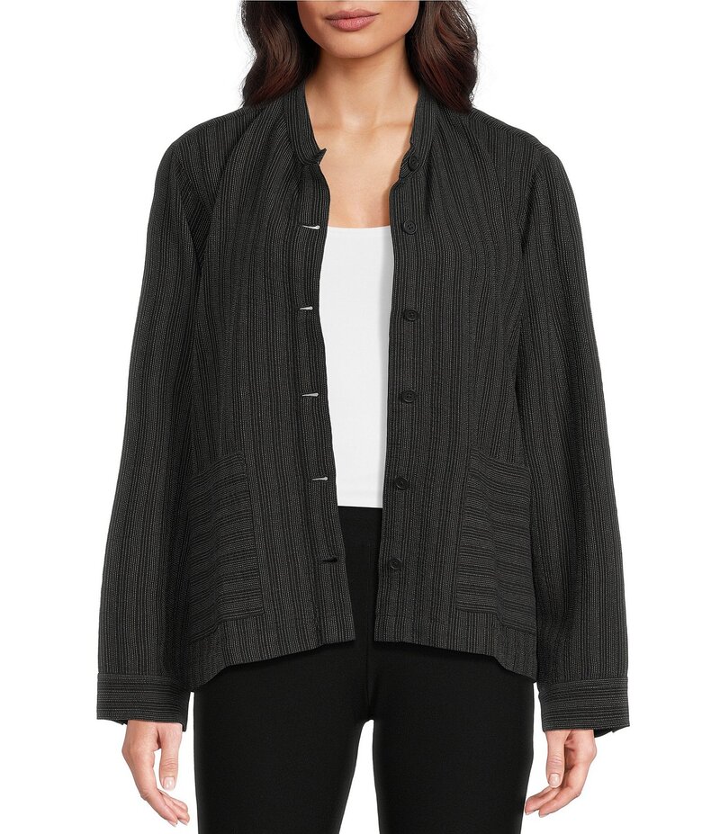 エイリーンフィッシャー レディース アウター コート シャツ コットン ジャケット Eileen Fisher Eileen West Organic Cotton Blend Woven Stripe Mandarin Collar Long Sleeve Shirt Jacket Black ブラック