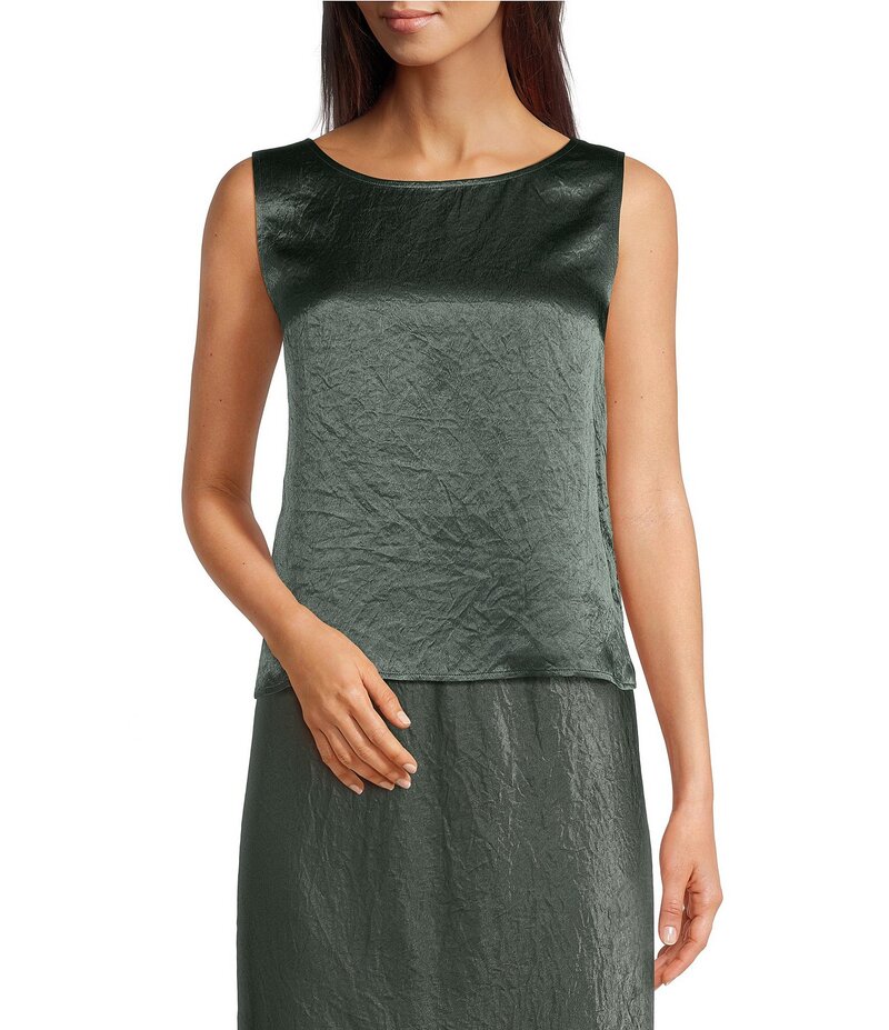 エイリーンフィッシャー レディース トップス シャツ サテン ノースリーブ Eileen Fisher Textured Satin Ballet Neck Sleeveless Short Shell Tank Everglade