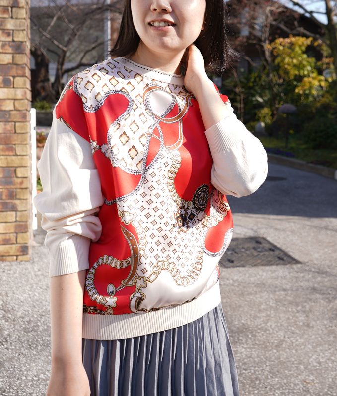 「cawaii french」奥行きのあるヴィンテージスカーフ柄のニット【ベージュ】【ブラック】【送料無料】