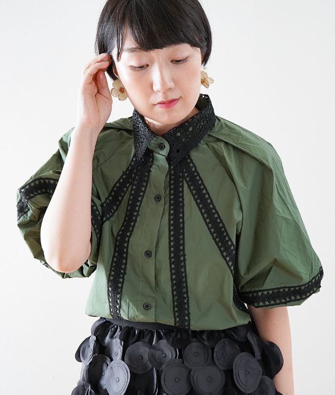「cawaii french」配色レースとバルーン袖の一癖シャツブラウス【グリーン】
