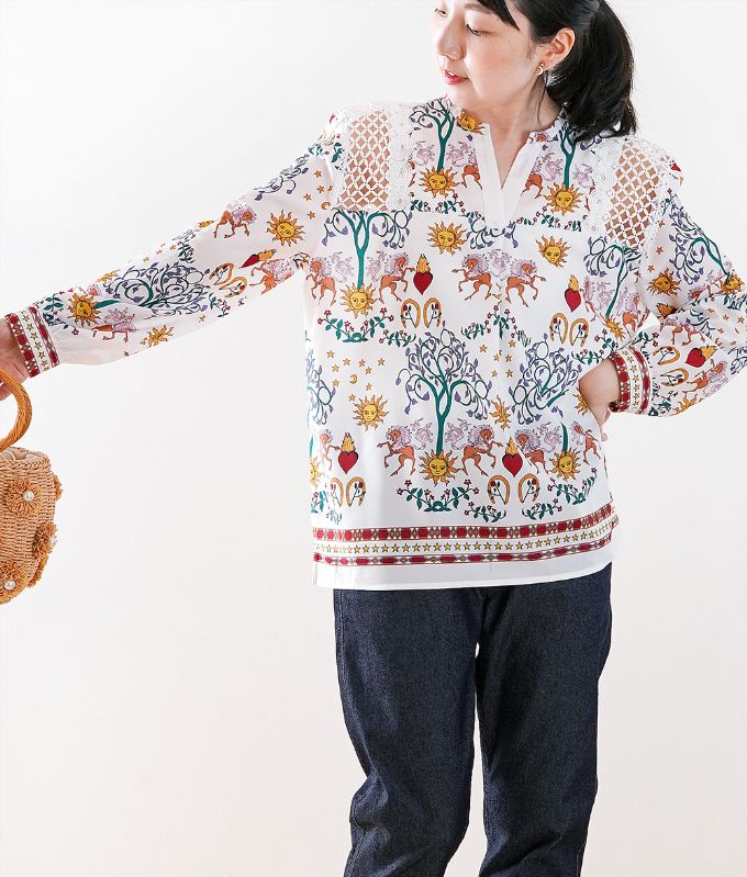 Details 太陽や星、花や馬など西洋風のシックなイラストが華やかにプリントされた大人のエレガント柄シャツ。 ショルダー部分の美しい透かしレースが目を惹き、涼し気かつおしゃれなディテール。 シフォン生地の柔らかい質感が着心地よく、春から秋までロングシーズンお召しいただけます。 カラフルな色調なのでトップスから色味をひろってカラーボトムスと合わせるのもおすすめです◎ ※生地の裁断により、柄の出方が違う場合がございますので、予めご了承下さい。 メール便 メール便 〇 サイズ 着丈:67cm 肩幅:48cm 袖丈:58cm 袖口:22cm アームホール:50cm 襟の深さ:20cm(中央) 襟幅:19cm バスト:118cm 裾幅:61cm 【モデル身長】160cm 当店のサイズ表記について その他 【素材】 ポリエステル 【生産国】 中国 【伸縮性】 なし 【透け感】 あり 【裏地】 なし 【ポケット】 なし 【商品番号】kss127 ※ご注意点※ ・ページ下の※はじめにご確認ください※をご確認の上ご注文ください。
