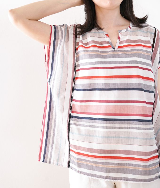 Details マルチボーダー×ストライプがカラフルで楽し気なスキッパーシャツ。 明るすぎない程よく落ち着いたトーンのカラーなので大人の柄アイテムとして大活躍。 コットンリネンの素材感とリラックスシルエットで、暑い日でもさらっと肌にまとわりつかず心地よく着用できます。 両サイドのはしごレースも涼し気でささやかなアクセントに。 マルチカラーの中から色をひろってカラフルなボトムスに合わせるのもおすすめです◎ ※生地の裁断により、柄の出方が違う場合がございますので、予めご了承下さい。 メール便 メール便 〇 サイズ 着丈:65cm 裄丈:33cm アームホール:42cm 襟の深さ:17cm(中央) 襟幅:17cm バスト:124cm 裾幅:64cm 【モデル身長】160cm 当店のサイズ表記について その他 【素材】 コットン/リネン 【生産国】 中国 【伸縮性】 なし 【透け感】 あり 【裏地】 なし 【ポケット】 なし 【商品番号】kss137 ※ご注意点※ ・ページ下の※はじめにご確認ください※をご確認の上ご注文ください。