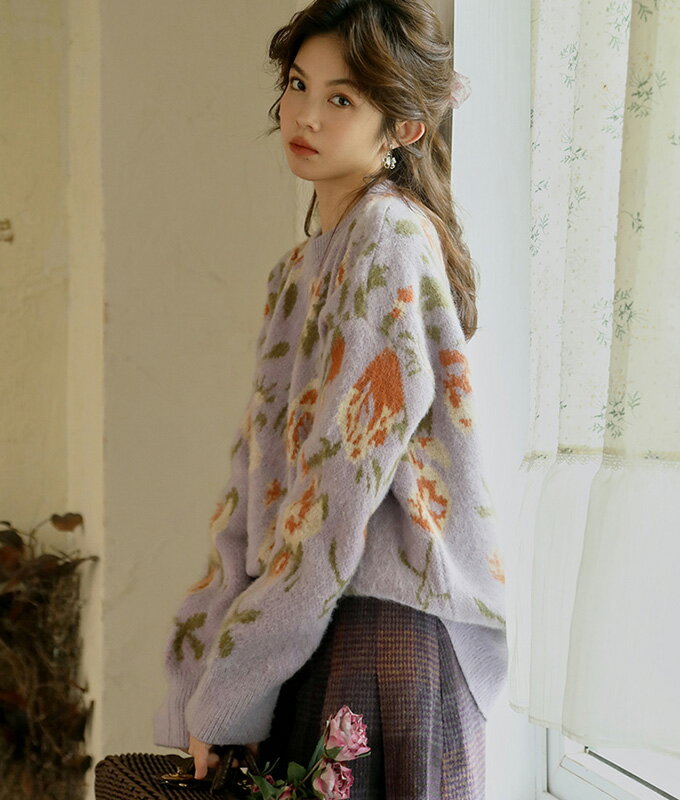 送料無料 トップス ニット セーター ジャカード 花柄 フラワー 丸首 ラウンドネック 長袖 オーバーシルエット パープル ブラウン「cawaii french」