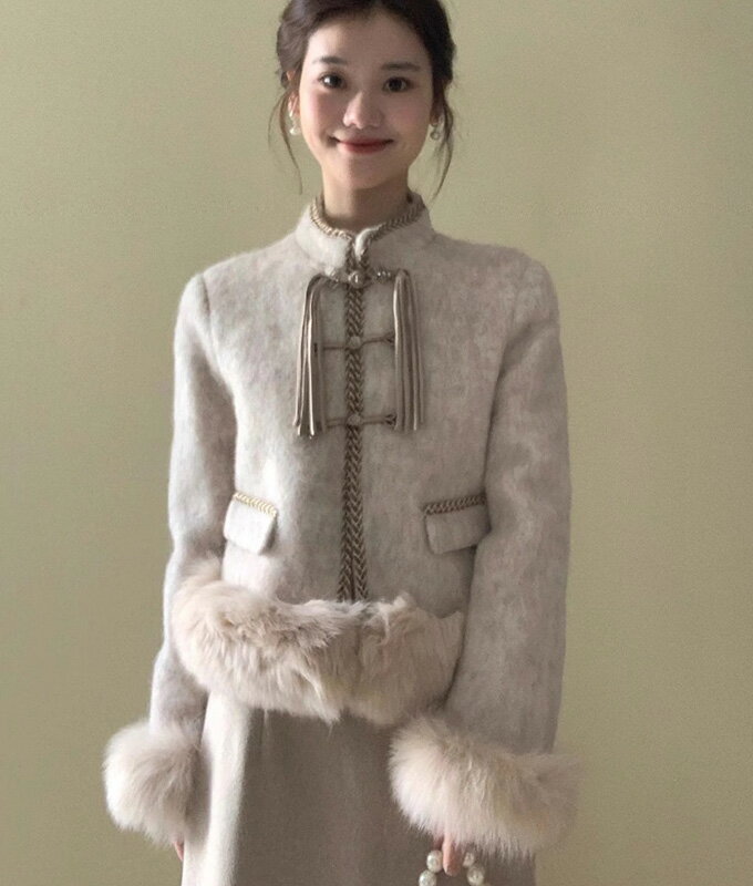 送料無料 アウター ジャケット コート スタンドカラー 長袖 フェイクファー トリム ナポレオン チャイナ フリンジ ライトグレー オフホワイト グレージュ「cawaii french」