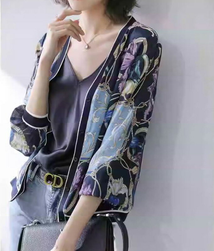 送料無料トップス カーディガン カーデ 柄物 スカーフ柄 チェーン柄 長袖 Vネック バイカラー 配色 ブルー 青 ネイビー 紺 ホワイト 白「cawaii french」