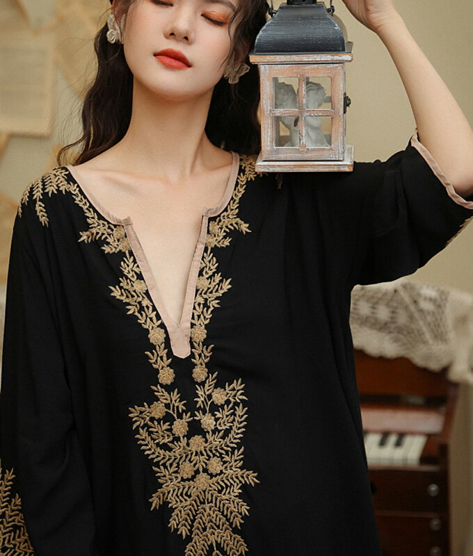送料無料 ワンピース ロング マキシ 七分袖 Vネック スキッパー 刺繍 ゴールド ヴィンテージ 黒 ブラック 「cawaii french」