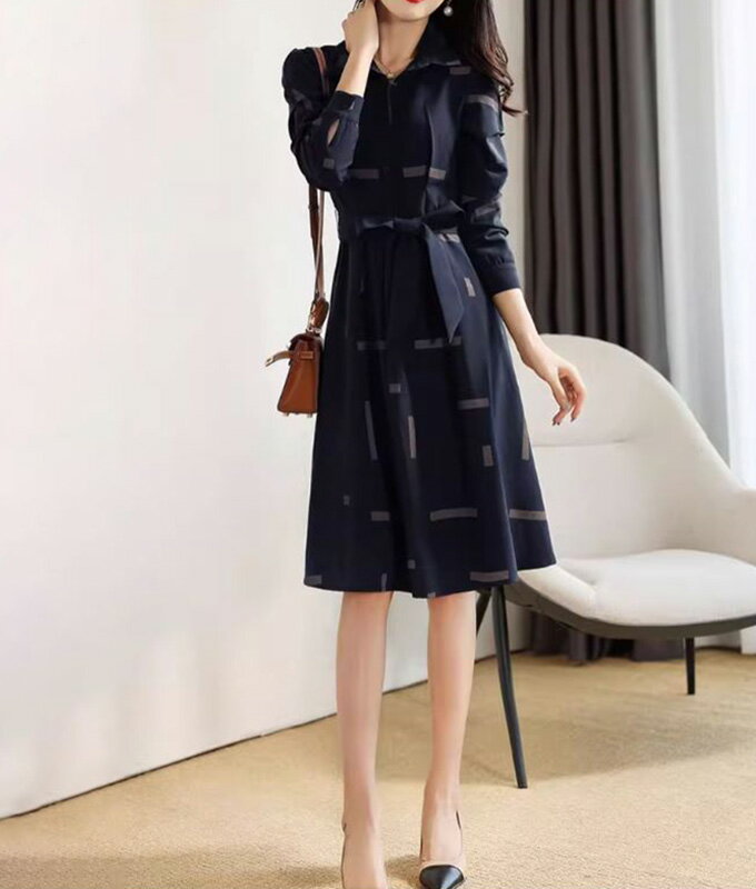 送料無料 ワンピース 膝丈 シャツワンピース シャツ 長袖 フレア リボン ライン柄 幾何柄 ネイビー 紺 フォーマル セレモニー 食事会「cawaii french」