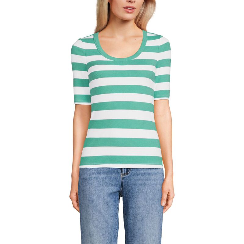 ランズエンド レディース トップス Tシャツ プラスサイズ Plusize Lands' Endrapey Rib Fitted Elbow Sleeve Scoop Neck Tee Frosted Green Stripe グリーン