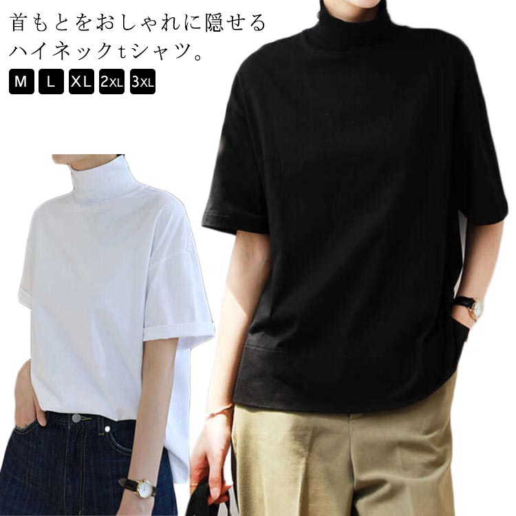 コットン tシャツ レディース 春 夏 秋 半袖 ハイネックtシャツ 送料無料 半袖tシャツ ハイネック ゆったり カットソー トップス 首元保護 UV対策 uvカット 無地 おしゃれ 綿 夏服
