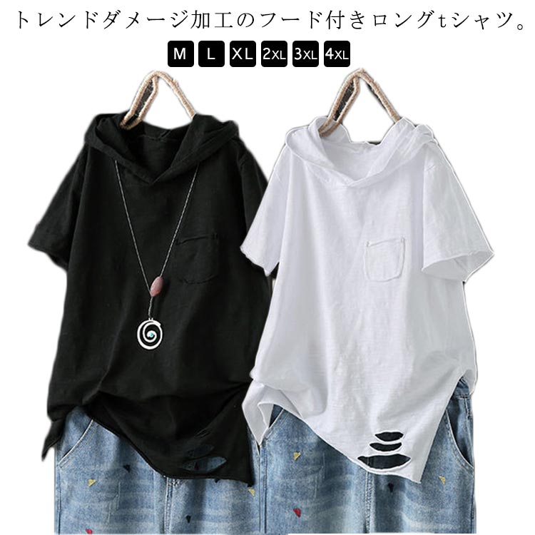 ダメージtシャツ パーカー レディース 夏用 プルオーバー 送料無料 トップス 薄手 tシャツ 半袖 ダメージ スリット ロングtシャツ ゆったり 体型カバー 大きサイズ 白 黒