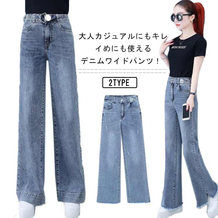 バックゴム デニムワイドパンツ ロング丈 デニムパンツ ワイド デニム ガウチョパンツ ジーンズ ハイウエスト 裾フリンジ カットオフ ボトムス パンツ ワイドパンツ キレイめ カジュアル 脚長 大きサイズ 送料無料