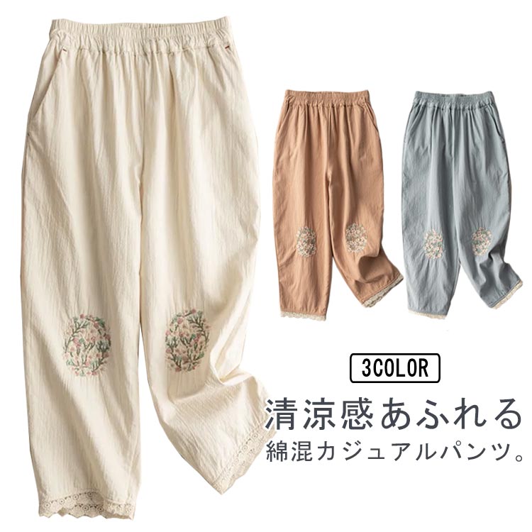 綿 パンツ レディース 刺繍パンツ 送料無料 カジュアルパンツ 裾レース ワイドパンツ サルエルパンツ 夏 薄手 涼しい 春夏 刺しゅう 可愛い ナチュラル