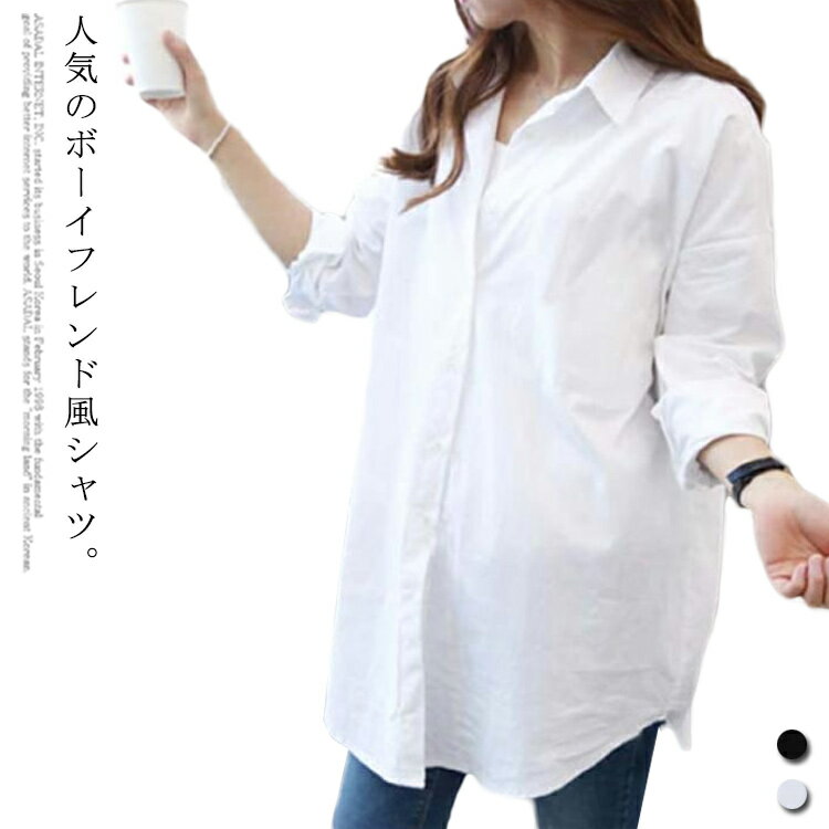送料無料 シャツ 綿100% 長袖 ロング丈 ゆったり 白シャツ 大きいサイズ シャツブラウス レディース チュニックシャツ マニッシュ 韓国ファッション BF 春 秋 ホワイト ブラック