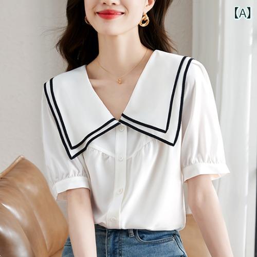 レディース トップス おしゃれ エレガント 通勤 オフィス カジュアル ファッション ベビー ドール カラー 半袖 シフォンシャツ 夏 フレンチ シャツ