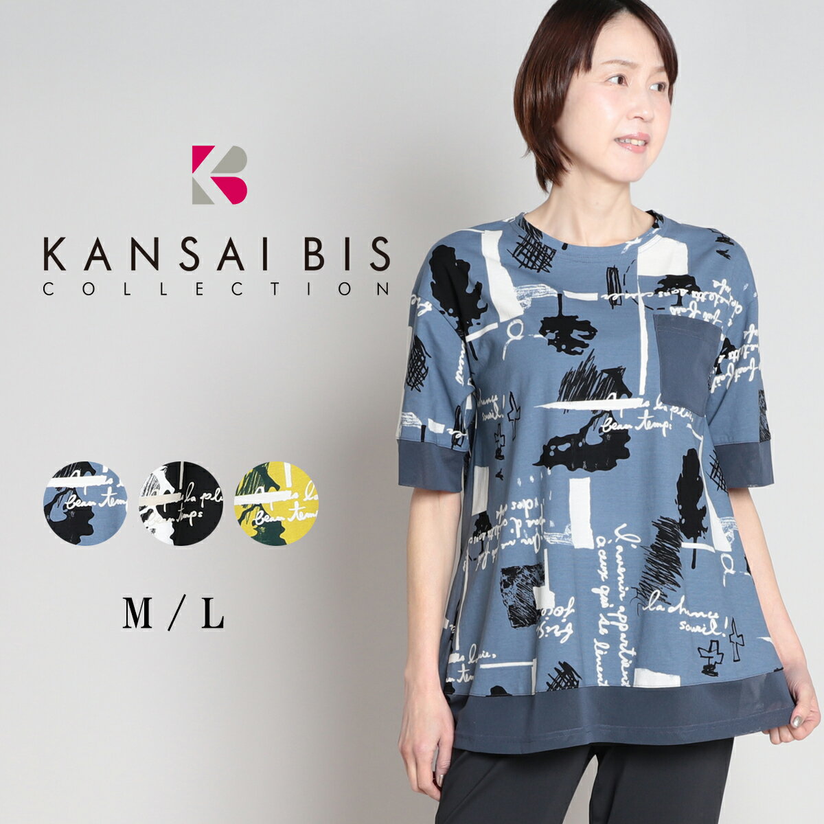KANSAI BIS カンサイビス ヘリテージMIX チュールチュニック レディース トップス プルオーバー チュニック Tシャツ プリントT ロンT 半袖 異素材 丈長め 体型カバー 重ね着 レイヤード 60代 70代 大人 M L サイズ 春 夏 秋 elife イーライフ