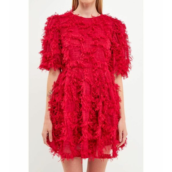 エンドレスローズ レディース ワンピース トップス Women's Gridded Mesh Feathered Puff Sleeve Mini Dress Wine