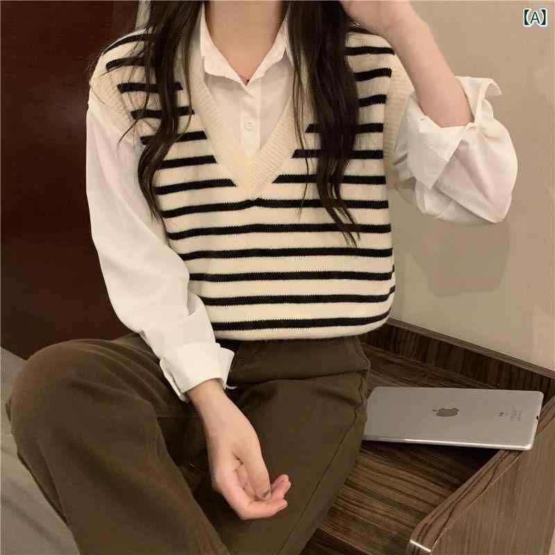 レディース ベスト ジレ 重ね着風 ドッキング 襟付き トップス ロングシャツ 春秋 レトロ Vネック ストライプニット ベスト レディース カジュアル ファッション ノースリーブベスト レイ ヤード カレッジ スタイル トップ