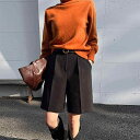 ハーフパンツ レディース 秋冬 ウール ショート 5分丈 ハイウエスト 厚手 タック おしゃれ ファッション ブラック