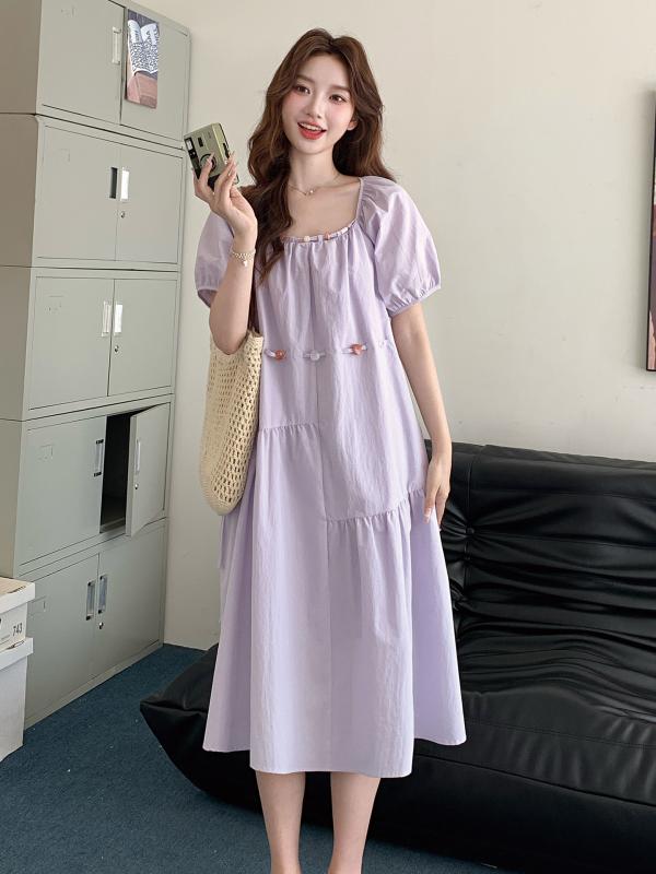 体型カバー きれいめ レディース ワンピース かわいい ラベンダー フレンチ パフスリーブドレス 女性用 2025夏 スタイル とても 美しい ゆったり aライン ミディアム 丈 スカート