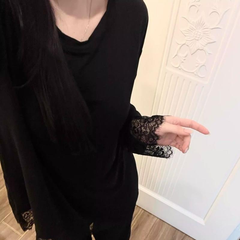 ルームウェア レディース 春秋 長袖 長ズボン 上下セット ポリエステル 黒 ブラック レース 接触冷感 薄手 部屋着 寝間着 リラックス ウェア 女性用
