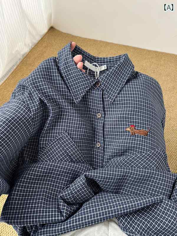 チェック柄 シャツ レディース とても 着心地が 良いです ダックスフント 刺繍 ブルー チェック 柄 ポロ カラー シャツ ジャケット レディース 春 シーズン レイ ヤード レトロ トップ