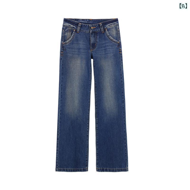 レディース デニム パンツ ピンク マンティスの ダーク ブルーの ローライズ ストレート レッグ ジーンズは 床を モップで 拭くような ウォッシュド ヴィンテージジーンズです