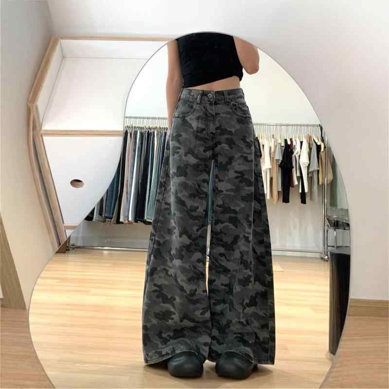 ・素材: 綿、デニム・パンツ丈: フルレングス・スタイル: ワイドレッグ・ウエスト: ハイウエスト・厚さ: 普通・カラー: 迷彩グレー・サイズ: S, M, L, XL, 2XL・スタイル: ストリート・生地: デニム・主素材の含有量: 50-70%・伸縮性: ややあり・パンツのタイプ: フレア・カテゴリ: ジーンズ・加工: 複合