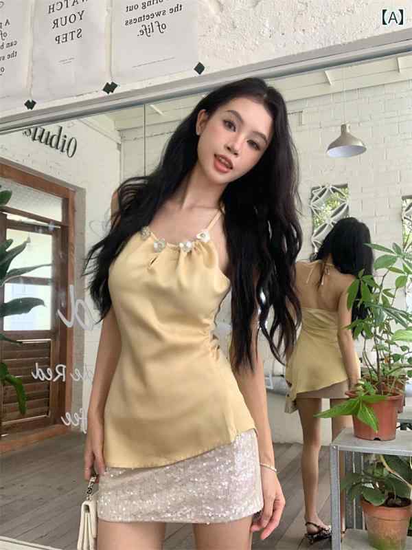 キャミソール スワン ネックの スクエア カラー ニット ベスト。 ショート スタイルで 鎖骨が 露出 しており、 単体で 着用 したり、 背中が 美しい スリムな ウエスト 丈の キャミソールの 下に 着用 したり できます。