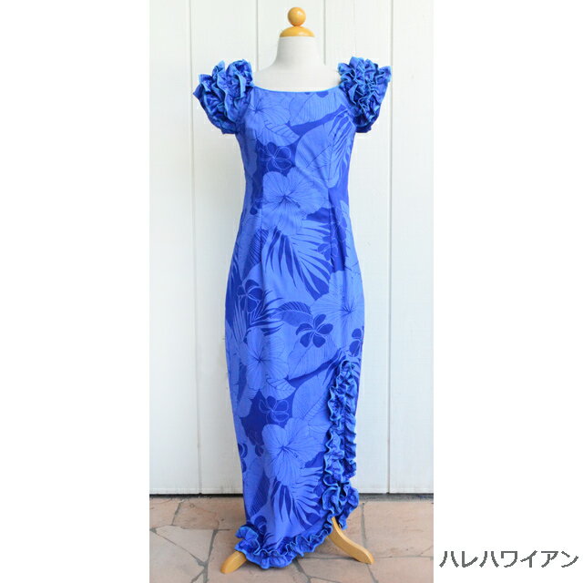 在庫処分セール ハワイアン ムームー デザイン of Naomi スリット ロングドレス 【 ビッグ ハイビスカス 】ブルー