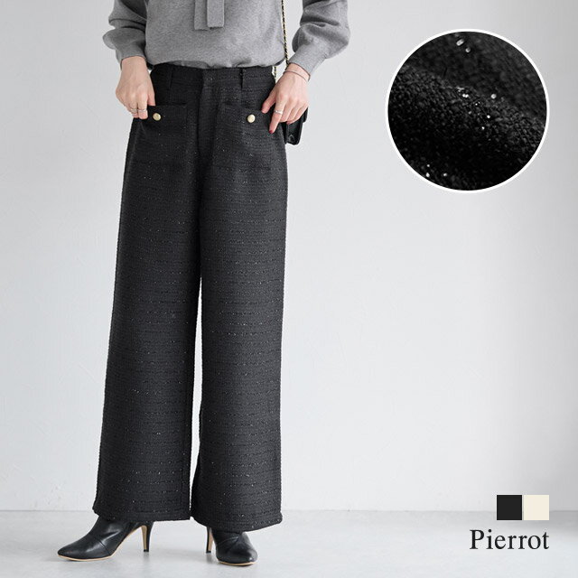 全品20%OFFクーポン!ボタンデザインラメツイードワイドパンツ ☆ ワイドパンツ ラメ ツイード 美シルエット パンツ トレンドライク 上品 きれいめ カジュアル ピエロ 送料無料