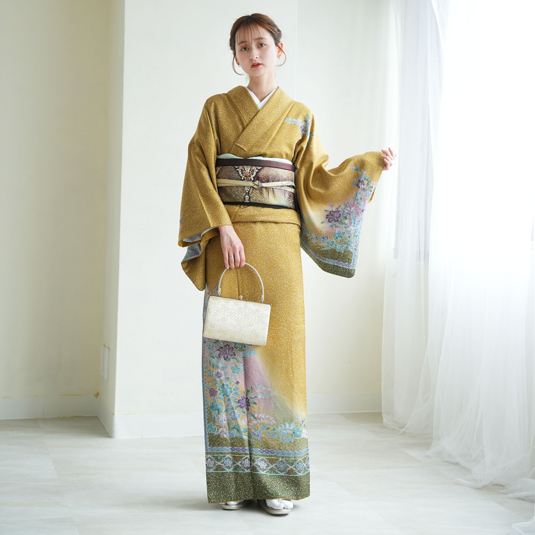 [商品画像について] ※商品画像はできる限り実物を再現するよう心掛けておりますが、お客様のモニターや閲覧環境によって大きく色味が異なる場合があります。 [商品在庫について] ※商品在庫は他店舗販売と共有しているため、更新のタイミングにより在庫切れの場合はやむをえずキャンセルさせていただく可能性があります。 ▼ ▼ レンタル前にこちらもCHECK! ▼ ▼ ▼ ▼ 着物コーデにおすすめのアイテム ▼ ▼■ Description 着付けに必要な小物はすべてそろっているフルセットレンタル。フォーマルな訪問着を簡単にレンタル頂けます。正絹で格式高いデザインですので、結婚式、お宮参り、パーティーなどにもご利用いただけます。【セット内容】着物・袋帯・草履・バッグ・長襦袢・帯〆・帯揚げ・重ね衿・肌襦袢・前板・着付けベルト・ウエストベルト・腰ひも3本セット・帯まくら・伊達締め・マジックベルト・衿芯・足袋(プレゼント)※お客様ご自身で補整用の薄手のタオルを3-5枚ご用意くださいませ。 --------------【 配送種別 】-------------- 往復送料無料(一部地域は別途差額送料)宅配便のみ ---------------【 ご注意 】--------------- こちらはレンタル商品となります。 レンタル状況により、ご希望日での レンタルができない場合もございます。 ご注文をいただきました翌営業日に、 当店よりレンタル確定のメールをお送りさせていただきます。 その時点でレンタル契約確定とさせていただきます。 ■ Detail [ カラー ] からし [ 素材 ] 着物・帯…正絹 [ 適応サイズ ] フリーサイズ(身長156-171cm) [ 実寸サイズ ] 身丈:約166cm裄丈:約68cm袖丈:約49cm前幅:約24cm後幅:約30cm足袋・草履 ワンサイズ(フリーサイズ)※約23cm-24cm前後に対応※ソックスタイプストレッチ足袋 [ 原産国 ] - [ 品番 ] 1040609300 ------------------- ご注意ください ------------------- トラブル防止のため、レンタル商品は、 【代金引換不可】 【後払い決済不可】 【コンビニ受取不可】 です。 楽天市場のシステム上、ご注文時に選択肢が表示されますが その場合キャンセルとなりますので予めご了承ください。 This is a rental product and is not shipped overseas. ▼レンタル安心パックはこちらから▼