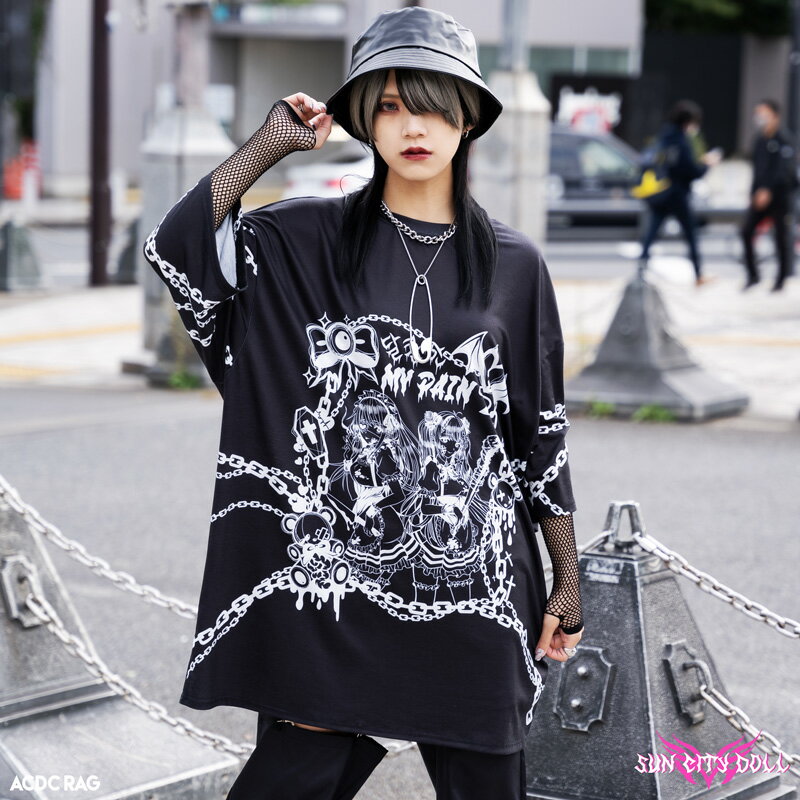 SWEET MY PAIN ヒュージTシャツ ブラック 原宿系 韓国 ファッション 半袖 パンク ロック V系 病み 病みかわいい 大きいサイズ レディース メンズ ダンス衣装 衣装 派手カワ イラスト チェーン 羽 羽根 悪魔 かわいい 個性的 黒 ACDCRAG [メール便可]