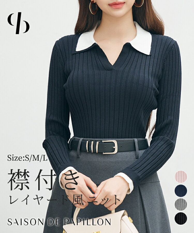 \25%OFFクーポン配布中/ニット トップス レディース プルオーバー ショート丈トップス ショート丈 リブニット 長袖 ハイゲージニット ニットシャツ 襟付きニット バイカラー ダブル配色 オフィスカジュアル 通勤服 20代 30代 40代 SAISON DE PAPILLON sdp8083