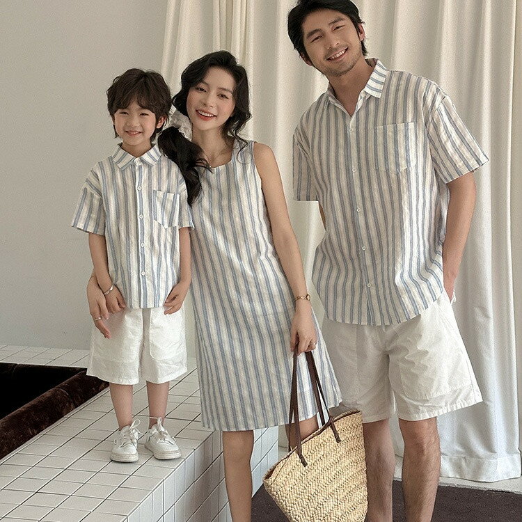 リンクコーデ 親子 セット 親子服 親子ペアルック 夏 夏服 家族お揃い 親子お揃い 親子ペア 親子コーデ 男の子 女の子 メンズ レディース ストライプ柄 半袖シャツ 半袖 ロングワンピース ママ パパ お揃い 旅行 家族写真 記念撮影 リゾート 家族活動 海辺 ビーチ 海旅行