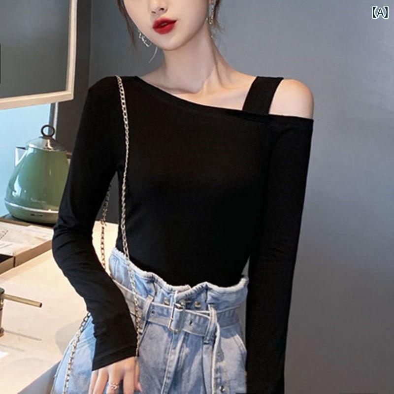 オフショルダー ロングスリーブ レディース トップス 黒の 長袖 T シャツ レディース 大きい サイズ オフショルダー 初秋 トップス レディース イン 新作 斜め 肩 ワン ライン ネック デザイン ボトムス シャツ