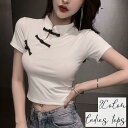 カットソー 半袖 トップス レディース 女性 チャイナ風 ミニ丈 ショート丈 クロップド丈 へそ出し Tシャツ ワンポイント おしゃれ かわいい カジ