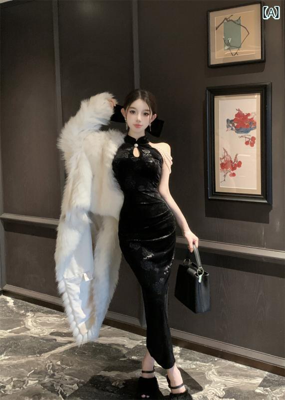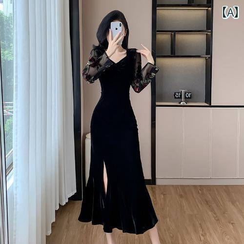 レディース ドレス 華やか セクシー 上品 パーティー 黒 スリム ドレス 軽量 涼しい 涼しい 社交界 レトロ ローズヒップ スリット フィッシュテール 起毛 ドレス
